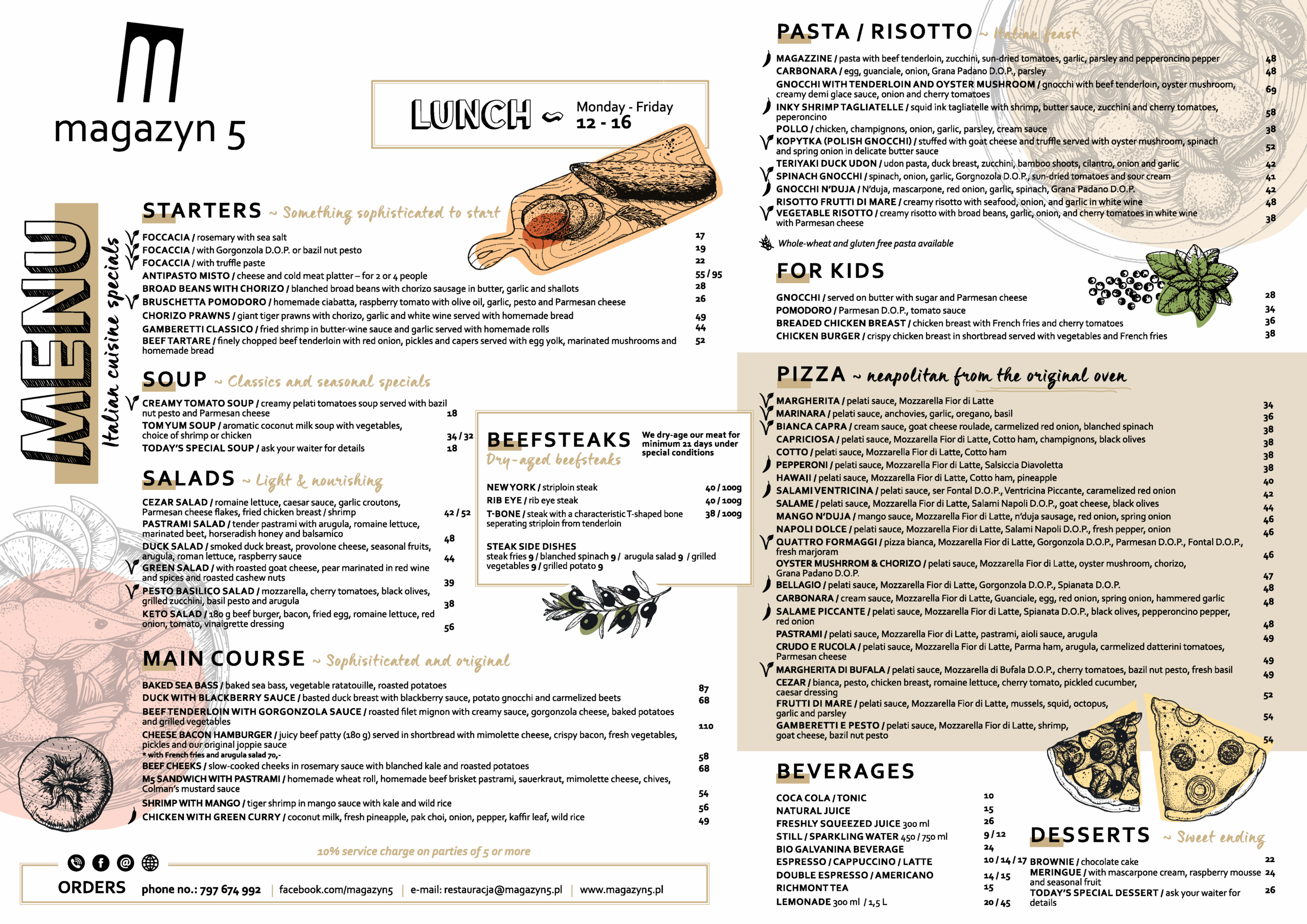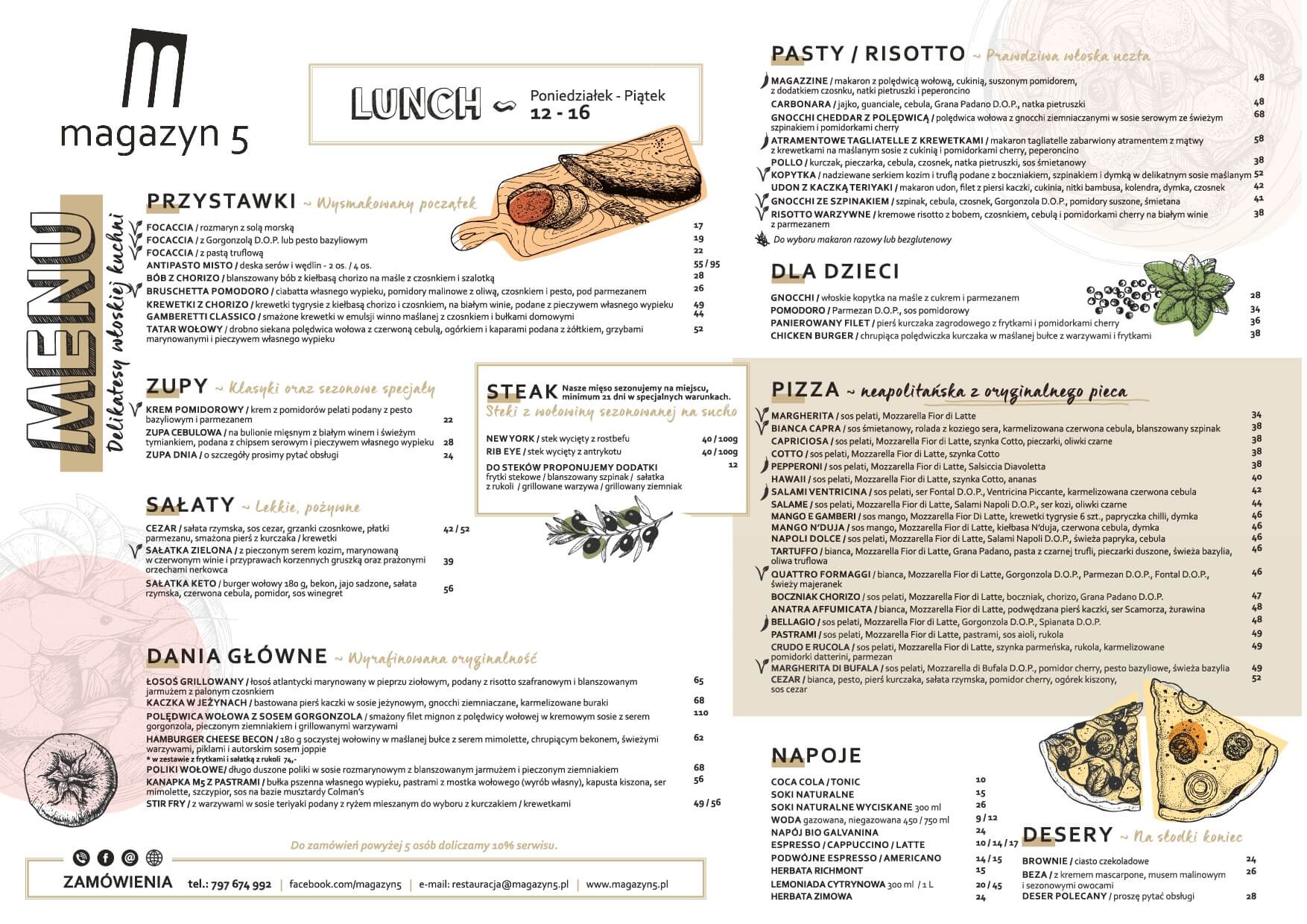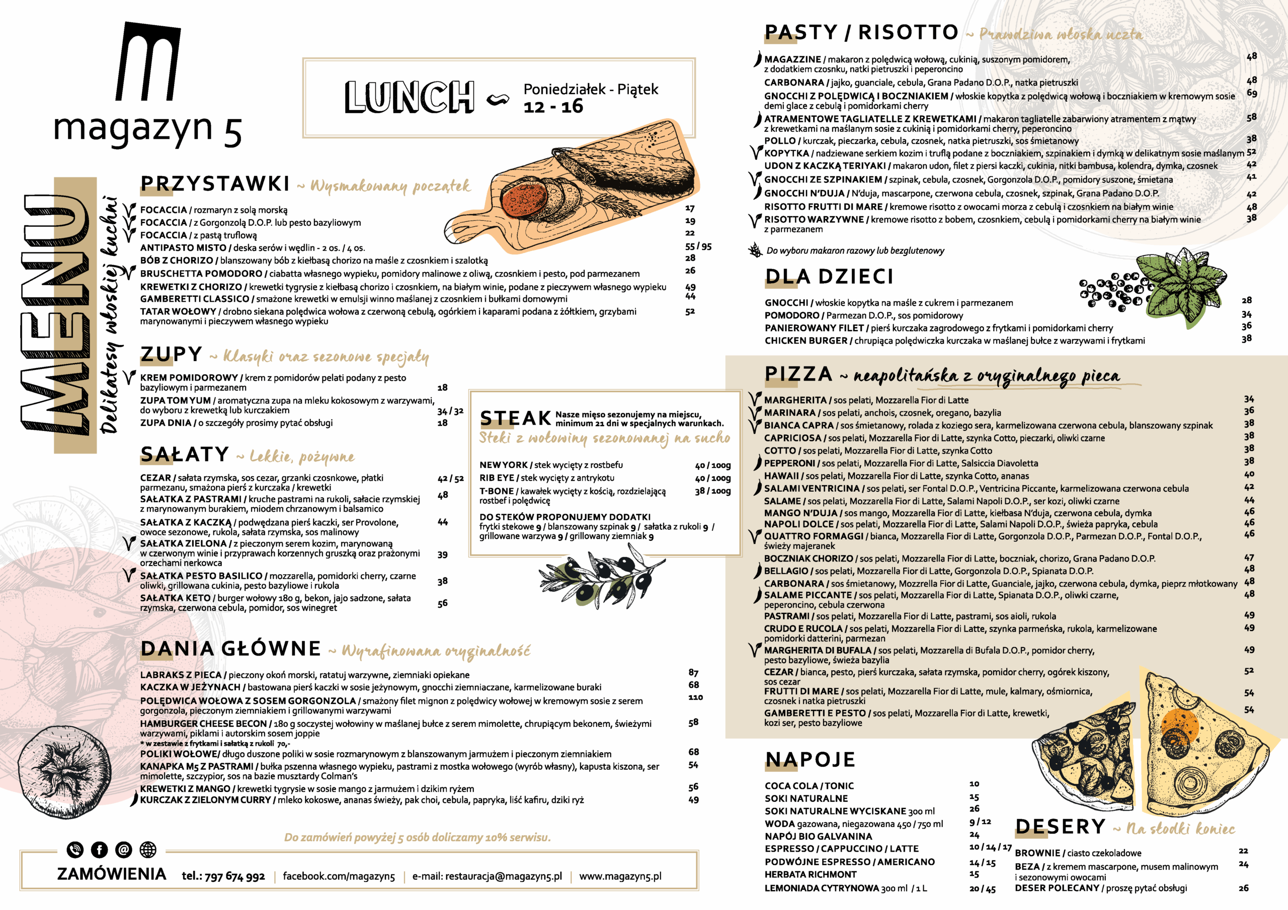 Bo na tym zależy nam najbardziej: dobrym czasie spędzonym w naszej restauracji! Wśród rodziny i przyjaciół, przy wysmakowanych daniach kuchni fusion, najlepszym winie z całego świata, lokalnym piwie z Polski czy Niemiec. Jesteśmy miejscem, w którym można cieszyć się najlepszą włoską kawą, zjeść popołudniowy lunch w przerwie między codziennymi zajęciami, czy spotkać się wieczorem na wyborną kolację z bliskimi. W Magazynie 5 organizujemy również przyjęcia okolicznościowe – zawsze zgodne z życzeniem Gości i naszym przesłaniem: kuchnia i czas spędzony razem ma przywoływać najlepsze wspomnienia!